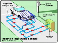 Current traffic systems use a variety of methods to optimize throughput in intersections. For instance, some use such things as lasers or rubber tubes filled with air to sense pressure (often the bane of motorcyclists and small car owners); however, the most common is the “inductive loop” method. You’ve probably seen the groves cut in the roadway just at the stop line of traffic lights. The common misconception is that there is a scale under these grooves, sensing the weight of a vehicle. In actuality, embedded in these grooves are what is known as an inductive loop. Inductive loops work by detecting a change of “inductance” or magnetic field. It uses a wire wrapped around some metal with a power source. When the wire wrapped around the metal is powered, it begins to build up a magnetic field. Sensors known as inductance meters continually check the inductance of the coil. Once a car, which contains a lot of different types of metal, enters the inductors’ magnetic field, the inductance rises and lets the system know a vehicle is parked over it. From here, different municipalities will use different algorithms to tell the lights how to use this information, thus how long lights stay red or green.Older incandescent traffic light bulbs typically used 175 watt bulbs. New LED traffic lights use only around 10-25 watts.